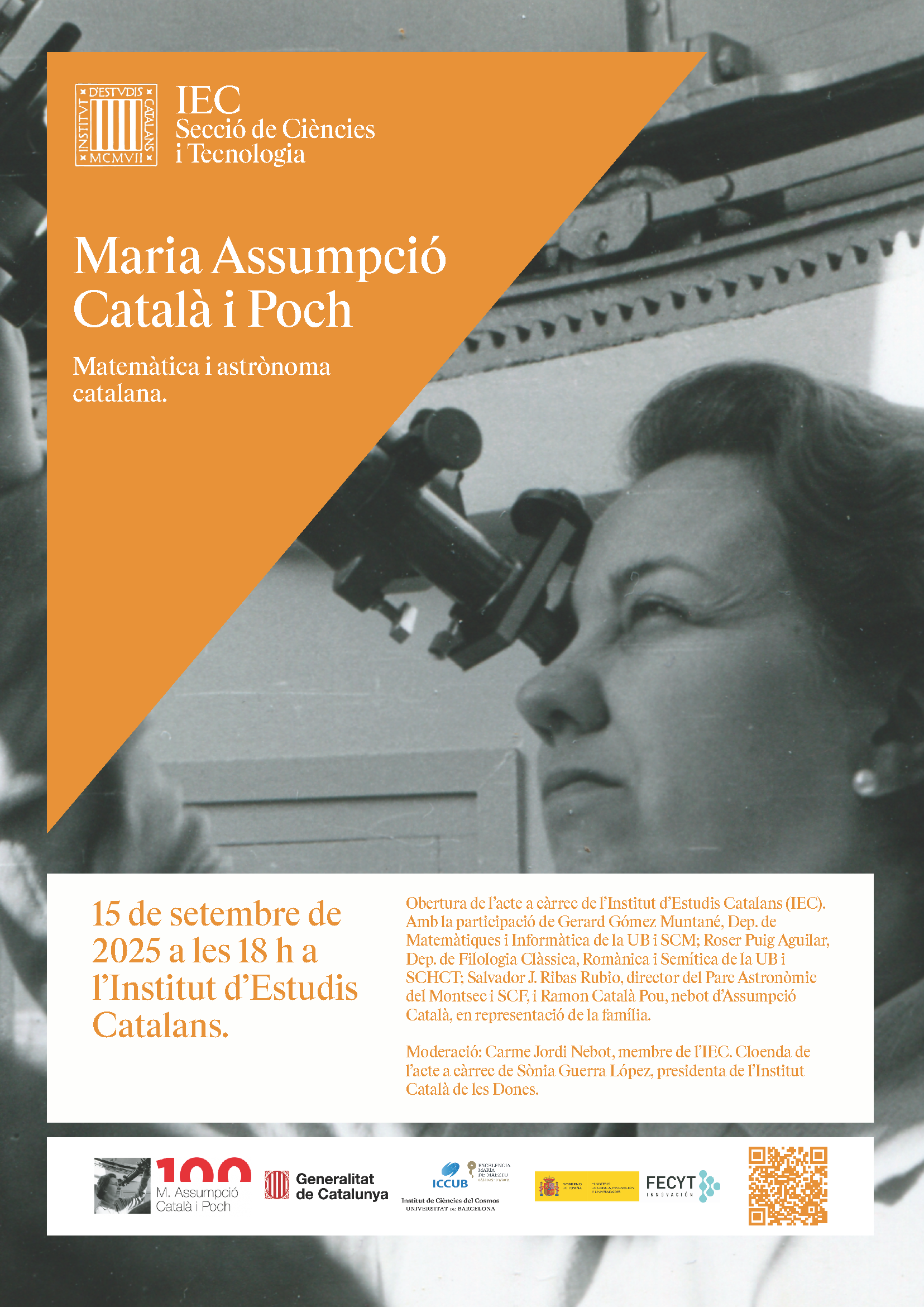 On Monday, September 15, 2025, at 6:00 PM, a roundtable dedicated to the figure of Maria Assumpció Català i Poch, a Catalan mathematician and astronomer, will take place at the Pere i Joan Coromines Hall of the Institute of Catalan Studies (c. del Carme, 47, Barcelona).